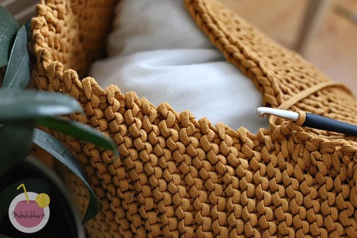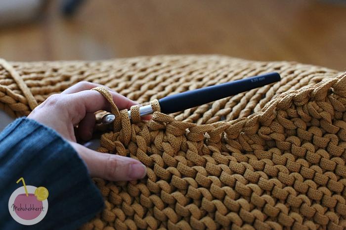 Voit kiinnittää yhteen reunaan joko vetoketjun, tai virkata siihen napinlävet. Minä itse virkkasin kaikki reunat toisistaan kiinni, eli tämän tyynyn voi avata vain purkamalla virkkausta. Se kuitenkin soveltuu hyvin tyynyyn, jota pestään harvoin. Sisällä minulla on siis noin 50 x 50 cm sisätyyny, jossa on kierrätetty vanhojen tyynyjen sisällöt, sekä myös saumurointijätettä.