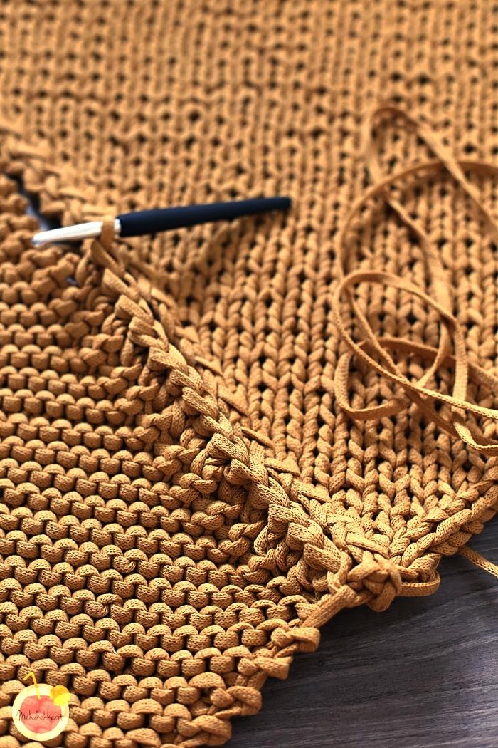 - jatka kerroksin 3-4 neulomista, kunnes toinen sivu (ei se jossa on keskeneräiset silmukat) on noin 50 cm.