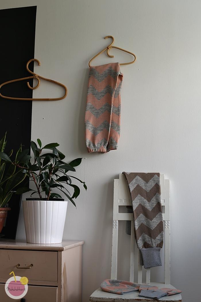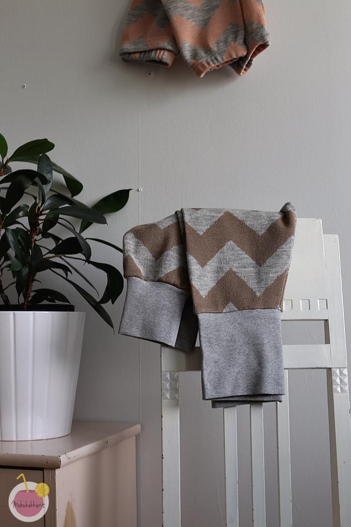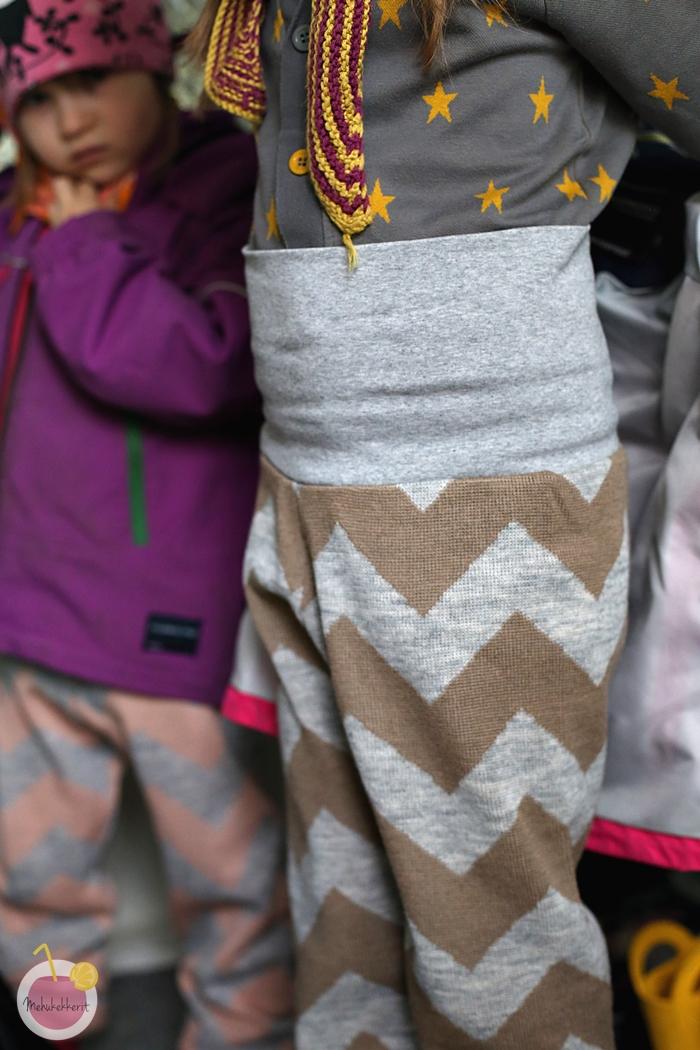Villahousut on helppo ommella oman tutun housukaavan mukaan. Itse ompelin koon 110 ja 122 housut aivan samalla kaavalla. Isoimpiin housuihin lisäsin tavalliset puuvillaresorit sekä vyötärölle että lahkeisiin. Pienempään kokoon ompelin kuminauhan vyötärölle leggingsien ompeluohjeen tapaan, sekä samalla tavalla myös kuminauhat lahkeisiin.