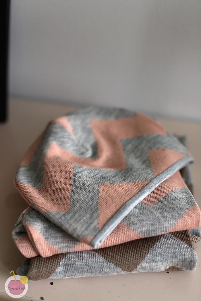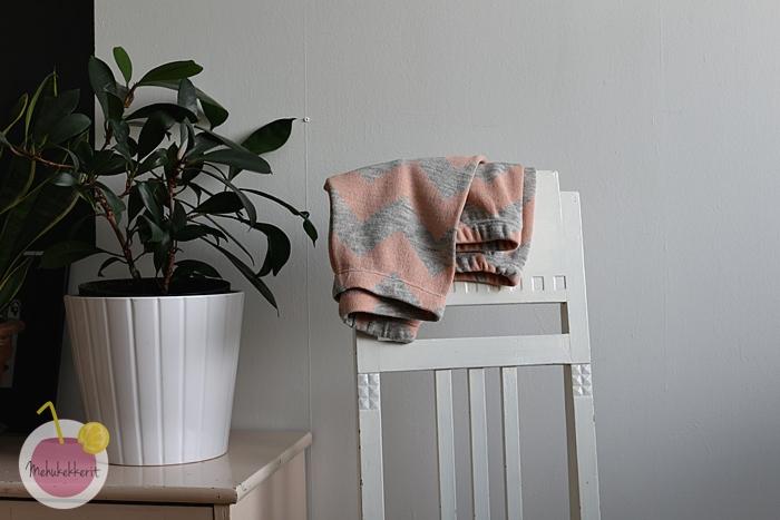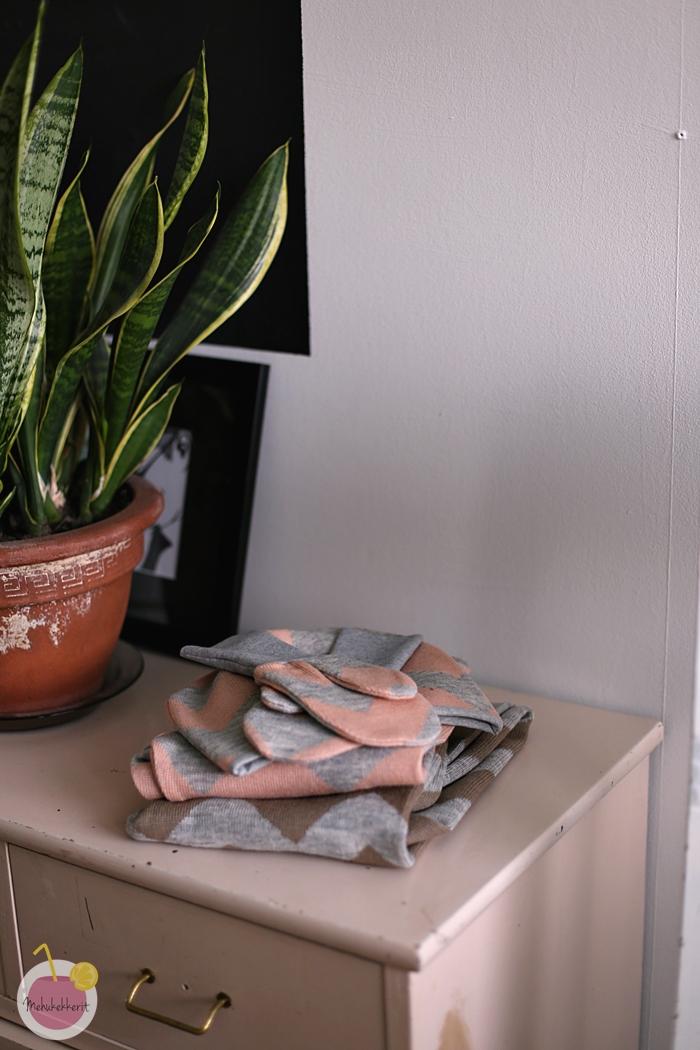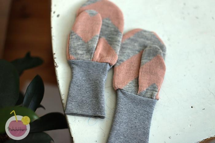 Villahousujen kaveriksi ompelin vielä jämistä yhden pipon ja hanskat. Molempiin ompelin sisälle puuvillajerseytä, ja varsinkin tumput ovat olleet lapsen suuressa suosiossa. Niiden kaava löytyy muuten Tehtaamo-blogista.