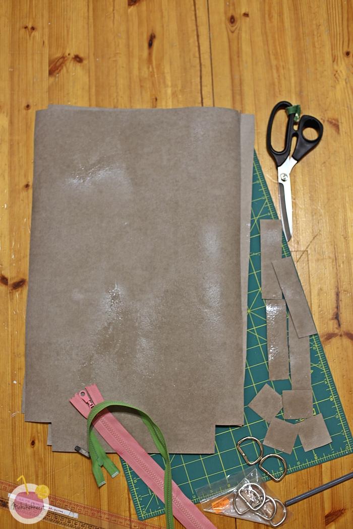 1. leikkaa nahkapaperista kaksi kuvan mukaista isoa palaa, joiden leveys 32 x 50 cm
