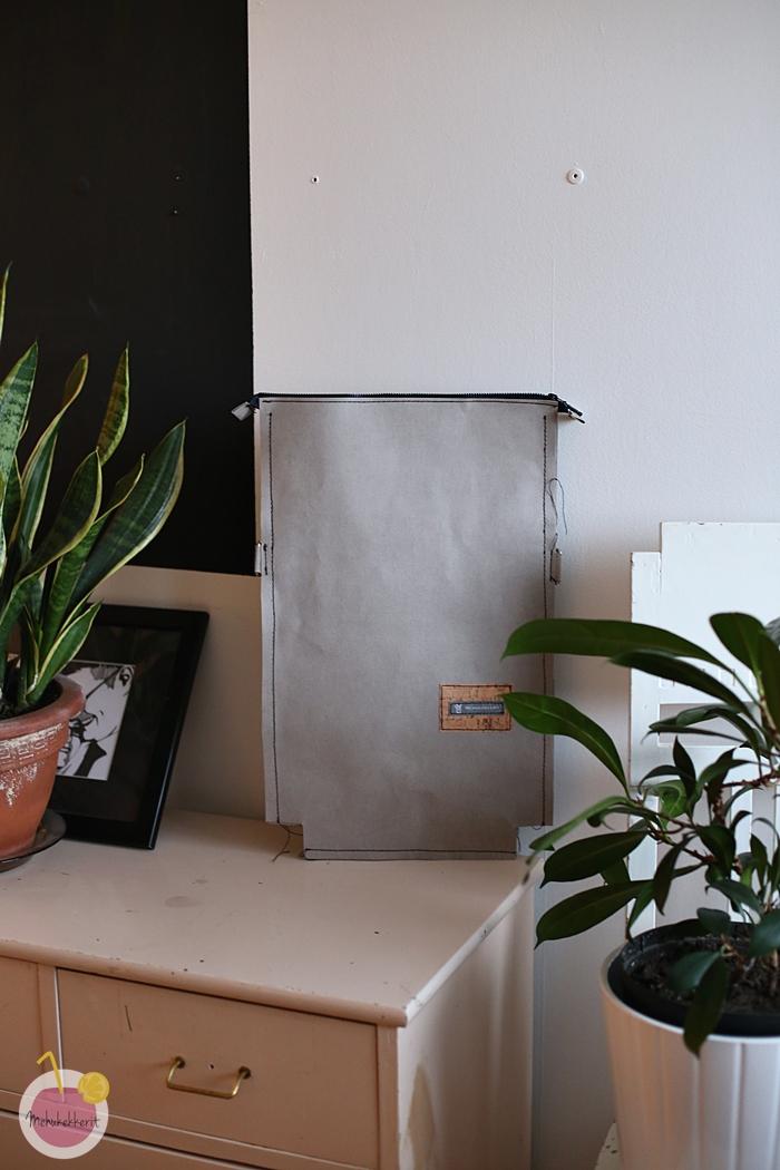 Itse en siis pessyt paperinahkaa ennen ompelua. Olen tosiaan kastellut sen monta kertaa, konepesu saisi aikaan vain hieman epätasaissemman pinnan. Sisälle voi tosiaan ommella vielä myös vuorin, jos sellaisen haluaa vaikka jälkeenpäin. Nyt kassi on toimiva näinkin!