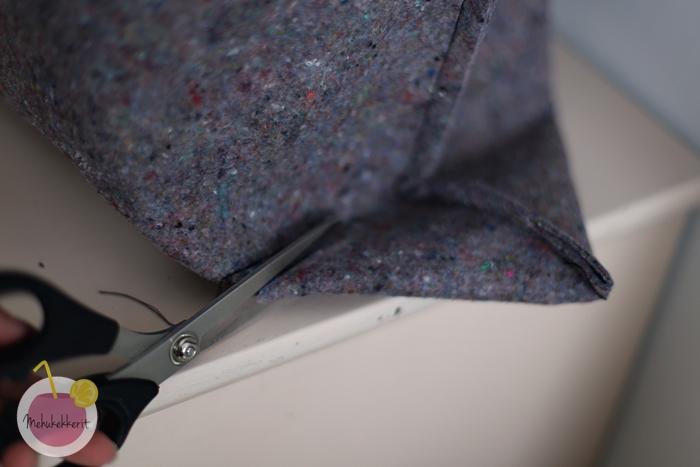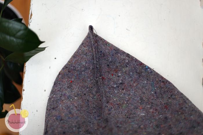 • taita kuvan mukaiset “kolmiot” pohjan saumojen päihin, ja ompele suoralla tikillä