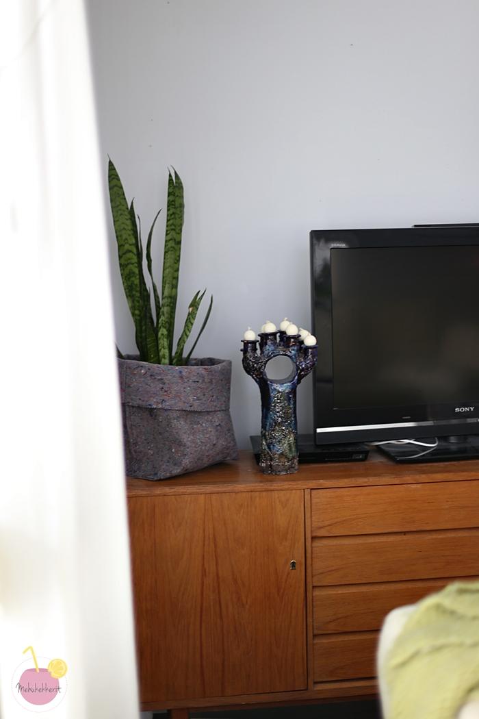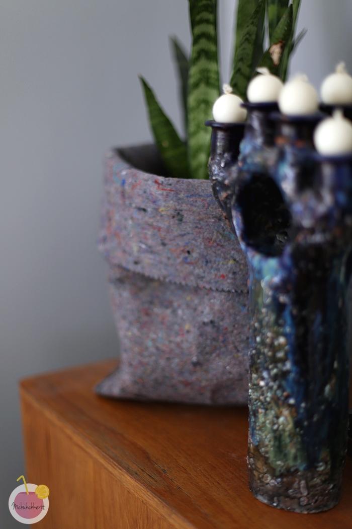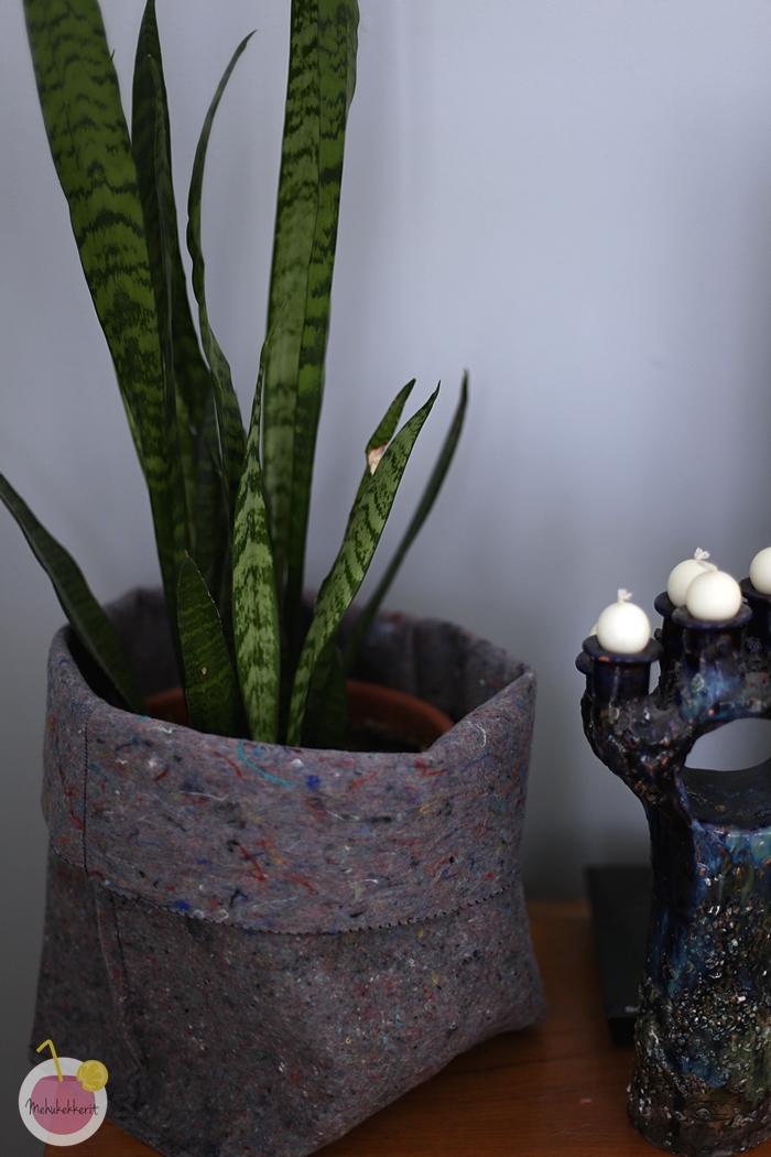 Olen pitkään jo tuijottanut olohuoneen nurkan anopinkieltä muoviruukussaan. Se kaipasi hieman säädyllisempää ylleen, joten ompelin huovasta kätevän ja erittäin nopean ruukunsuojuksen. Sen ompelu on helppoa, ja kahvoilla tästä olisi saanut vaikka myös kassin.