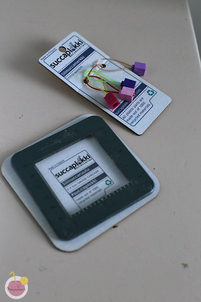 Puikkojen lisäksi neulomisessa kaipaa mittanauhaa, silmukkamerkkejä, kerrosmerkkejä, hyvää lankaa ja usein myös paperia ja kynää. Minä ostin ensimmäiset kunnolliset ja laadukkaat silmukkamerkkini silmukkamitan kera Succaplokilta. Ihana tukea kotimaista käsityötä niin tarvikkeissa kuin langoissakin. Tämänkin Kässäkerho Pompomin langan ostin omaa pipoani varten, mutta lapsi omi sen heti ostokset nähtyään. Lasten kanssa saimme myös hieman keskustella siitä kuka näillä silmukkamerkkilegoilla oikein leikkiikään.
