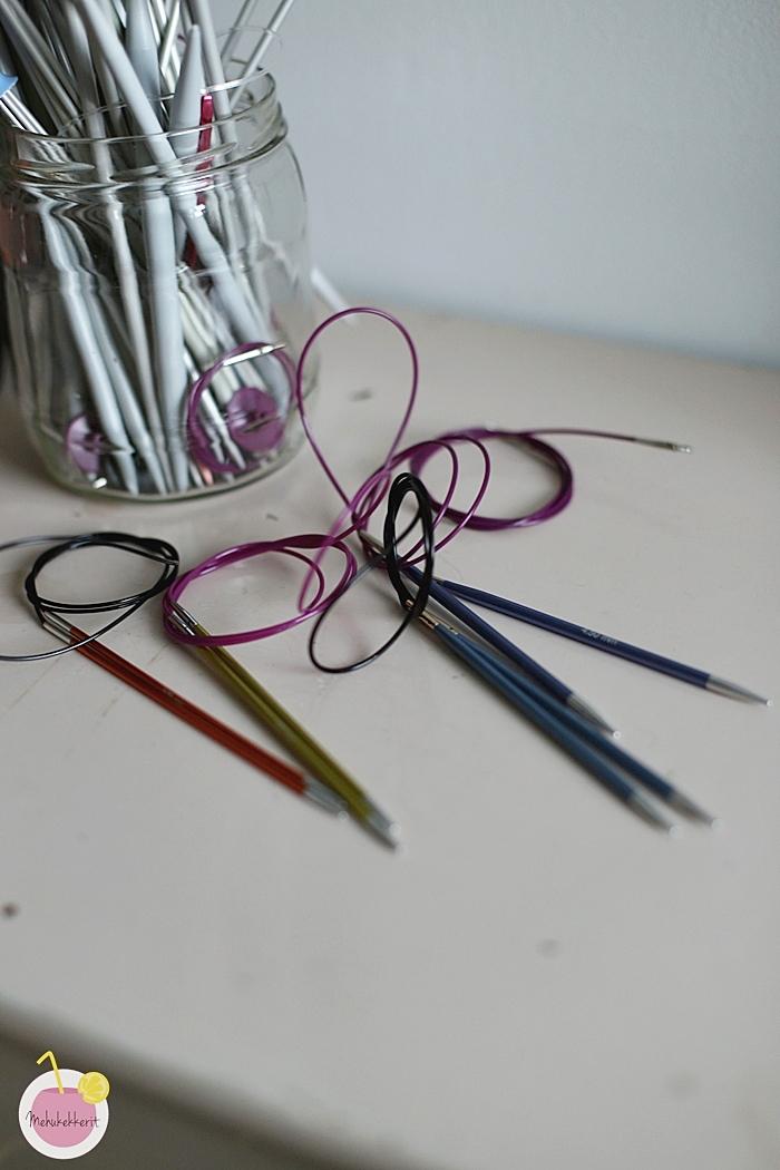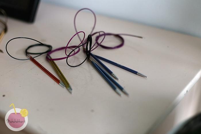 Messuilta löydetty uusin kumppanini on kuitenkin Chiaogoo Red Lace-puikot. Ne on tehty ruostumattomasta teräksestä, ja itse puikko-osa ei juurikaan eroa Zing mallista. Mutta Chiaogoo-puikoista on kyllä suureksi tähdeksi, sillä niiden pyöröpuikkojen kaapeli sisältää myös terästä, ja se ei siis jää samalla tavalla muotoonsa kuin muovinen kaapeli. Oivallista tuotekehitystä, ja minä rakastuin ainakin heti!