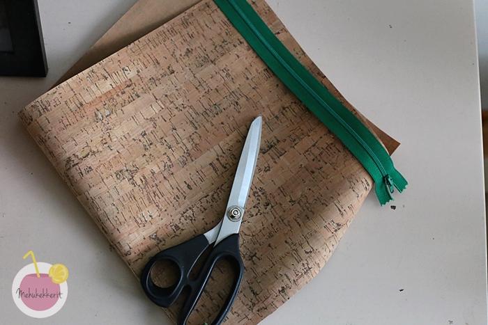 1. leikkaa korkkikankaasta kaksi noin 40 x 27 cm pala (tarvitset myös tuon lyhyemmän sivun mittaisen vetoketjun!)