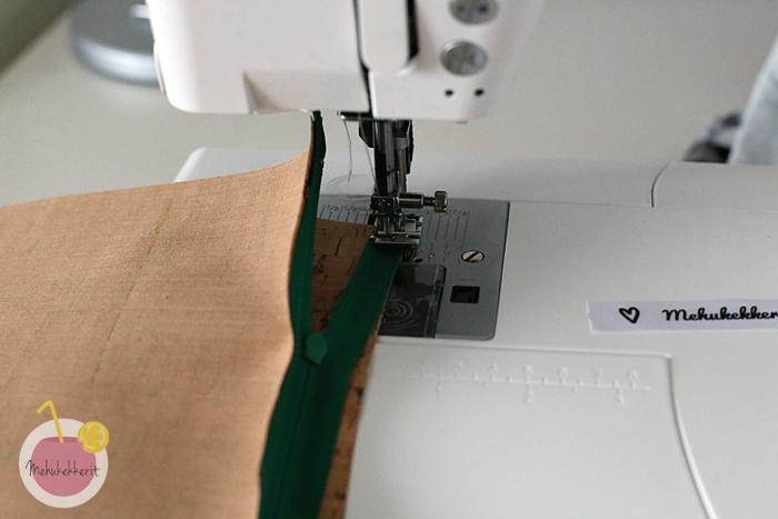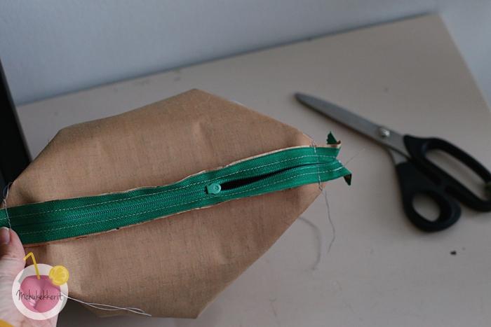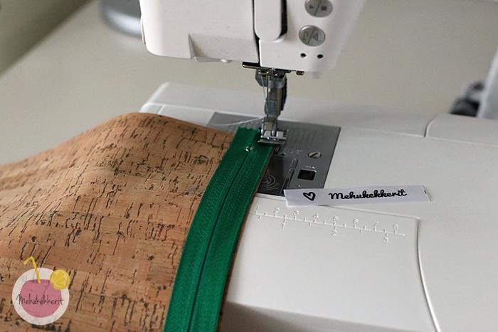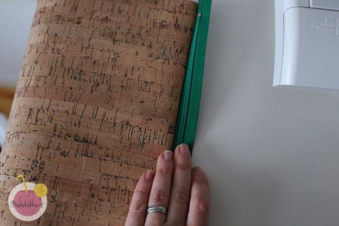 2. Asettele vetoketju keskelle yläreunaa, ja ompele vetoketju suoraan kiinni toisesta reunasta korkkikankaaseen. Yritä pärjätä ilman nuppineuloja, helpointa on ommella kankaan päältä, vetoketjun ollessa sen alla.