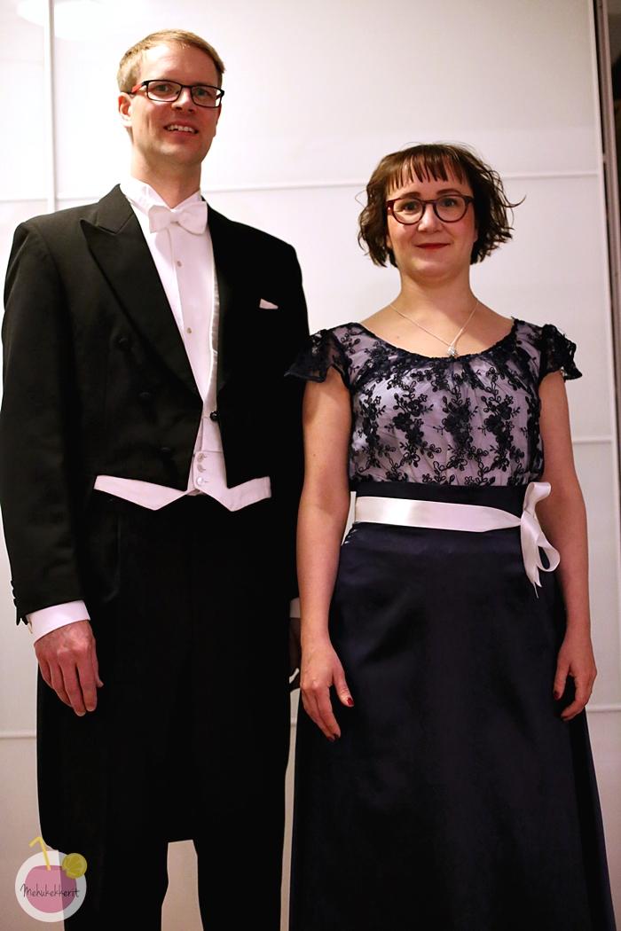 Me juhlimme itsenäisyyspäivää eilen kutsuvierastilaisuudessa Vanajanlinnassa. Ompelin itselleni pitkän iltapuvun, ja mieheni vuokrasi frakin juhlaa varten. Puvun suunnittelussa (aikaa suunnitteluun ja ompeluun oli kaksi viikkoa, kiitos inspiraatiosta Saumanvaran ompeluryhmä) huomioin mahdolliset seuraavat käyttövuodet ompelemalla yläosan erilleen, jotta alaosaa (tai yläosaa) voi helposti kierrättää yhdessä tai erikseen muihinkin juhliin. Kampaaja viimeisteli hiukseni, ja myi ihanat Bohon luonnonmukaiset meikit naaman viimeistelyyn. Oli siis pitkästä aikaa oikein juhlava fiilis!