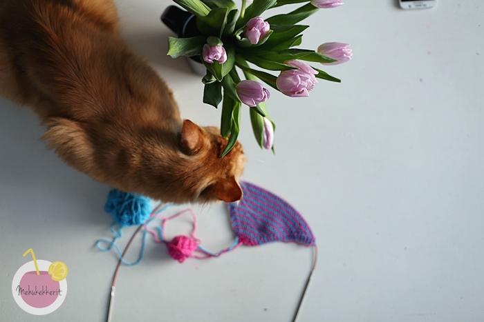 - jatka samalla tavalla tasaisia kavennuksia, kunnes jäljellä on 6 silmukkaa. Neulo 2o, ja vedä ensimmäiseksi neulottu silmukka toisen yli. Neulo 1o, ja vedä puikolla aiemmin ollut sen yli. Jatka näin päättelemistä löyhästi.