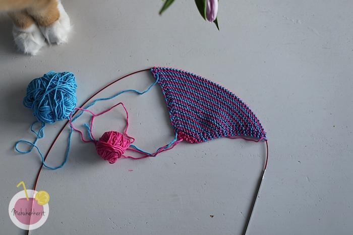 - neulo 1o ja kaksi seuraavaa silmukkaa takaa oikein yhteen. Neulo muut oikein, kunnes jäljellä on 3 silmukkaa. Neulo 2 silmukkaa edestä oikein yhteen, ja 1o.