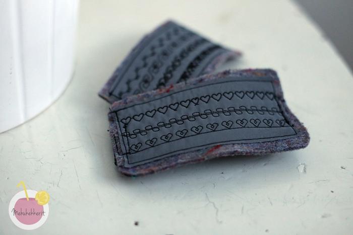 Aivan ensimmäisenä ihastuin kuitenkin erilaisiin koristeompeleisiin. Niitä löytyy hyvin, ja oikeastaan juuri enempää en ole koskaan tuntenut tarvitsevanikaan. Tarkkaan jos lasketaan, löytyy koneesta 136 erilaista ommelta. Pärjää siis arjessa jo aika kätevästi! Jo ensimmäisenä iltana testasin koristeompeleita nopeaan heijastimeen, ja näistä innostui myös lapsenikin. Vielä kokeilematta on erilaisten kirjainten ompelu, ompeleiden yhdistely ja tallentaminen muistiin.