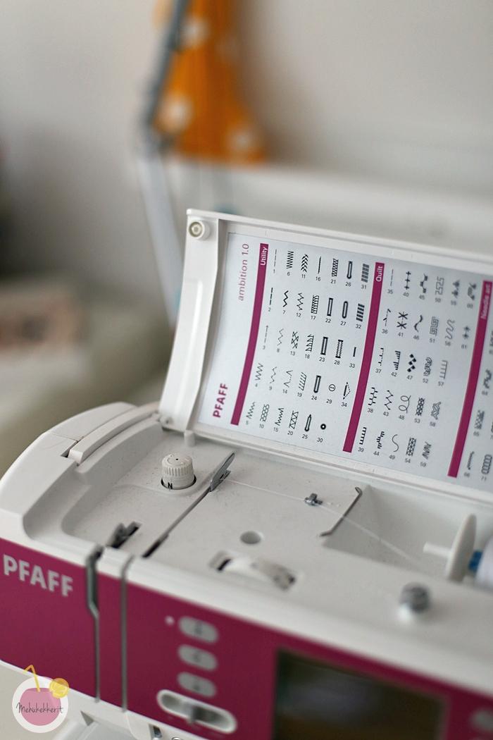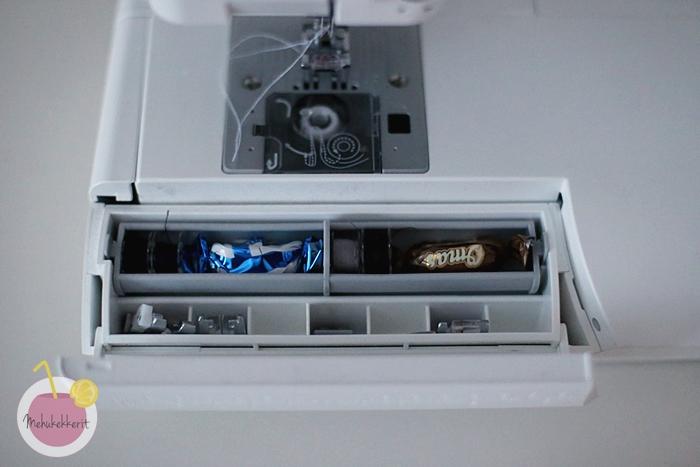 Itse ohjekirja on Pfaffin tyylille tyypillisesti selkeä. Alun henkisen tuskailun jälkeen pääsin aika nopeasti kiinni koneen maailmaan ja jopa tosiaan kokeilemaan itselleni aivan uusia ompeleitakin. Kaksoisneula toimii hyvin ilman erillisiä säätöjäkin, paininjalan vaihto on helppoa, ja tulipa jopa testattua kuinka monta karkkia mahtuu koneen säilytysrasiaan. Aika hyvin mahtui.