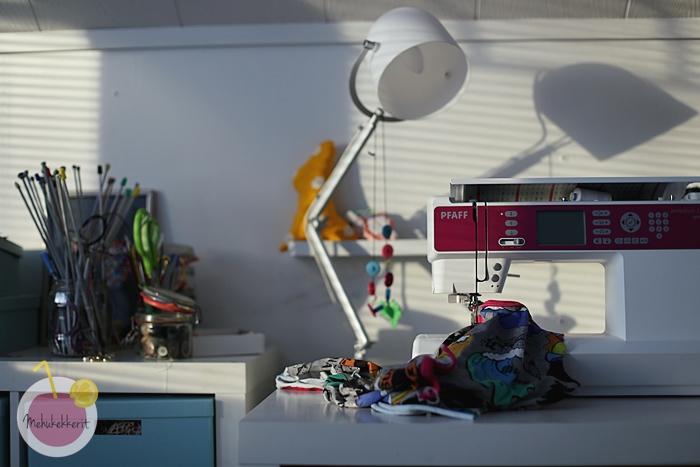 Itse koneen mukana tulee siis tietty määrä puolia ja peruspaininjalat. Näillä pärjää jo todella pitkälle, ja Pfaffin puolia ja paininjalkoja löytyy ompelukoneliikkeistä hyvin saatavilta. Koneen lokerikkoihin mahtuu hyvin eväitä, pinkki kaunotar oikein kutsuu ompelemaan iltaisin ja koneen hyvät led-valot takaavat tarkan ompelun myös iltahämärässä.