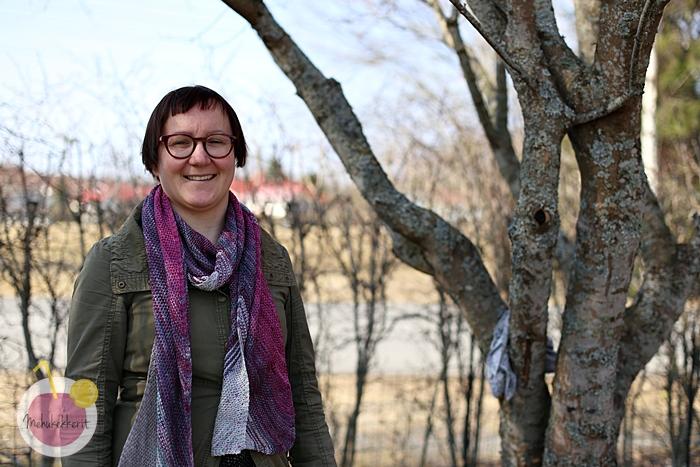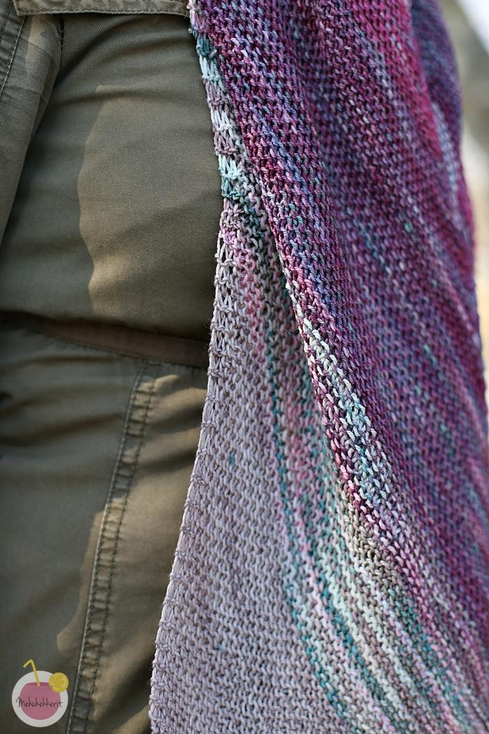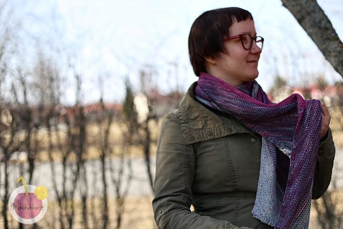 Huivit kannattaa aina neuloa ainakin pari kokoa liian isoilla puikoilla. Minä neuloin tämän huivin 3,75 puikoilla, löysällä käsialalla. Raidoitin noin 5-6 kerrosta, jonka jälkeen jatkoin uudella värillä. Raidoitus näkyy mielenkiintoisesti ns. nurjalla puolella, josta tuli minulle kyllä se oikea puoli. Ja koska huivi on neulottu aina oikein, voi sitä pitää huoletta ihan miten vaan kaulassa. Se sopii niin kevääksi, syksyksi, kesän kylmiin iltoihin, kuin myös talveenkin. Helppo ja nopea huivi siis!