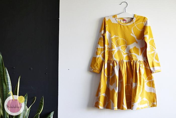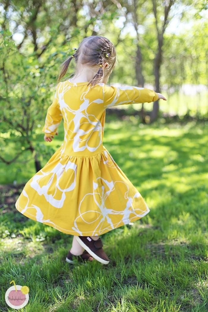 Keltainen KUKINTO taas sai muotonsa rypytettynä mekkona. Tässäkin on käytetty samaa paitakaavaa kuin yllä, mutta nyt helmaksi on leikattu leveä kaitale. Normaalisti mittaan helman leveydeksi noin 1,5-2 kertaa paitakaavan leveys. Koska teen näitä aika usein, helman pituus alkaa tulla jo kuin itsestään. Harvoin enää edes mittaan sitä vanhasta mekosta.