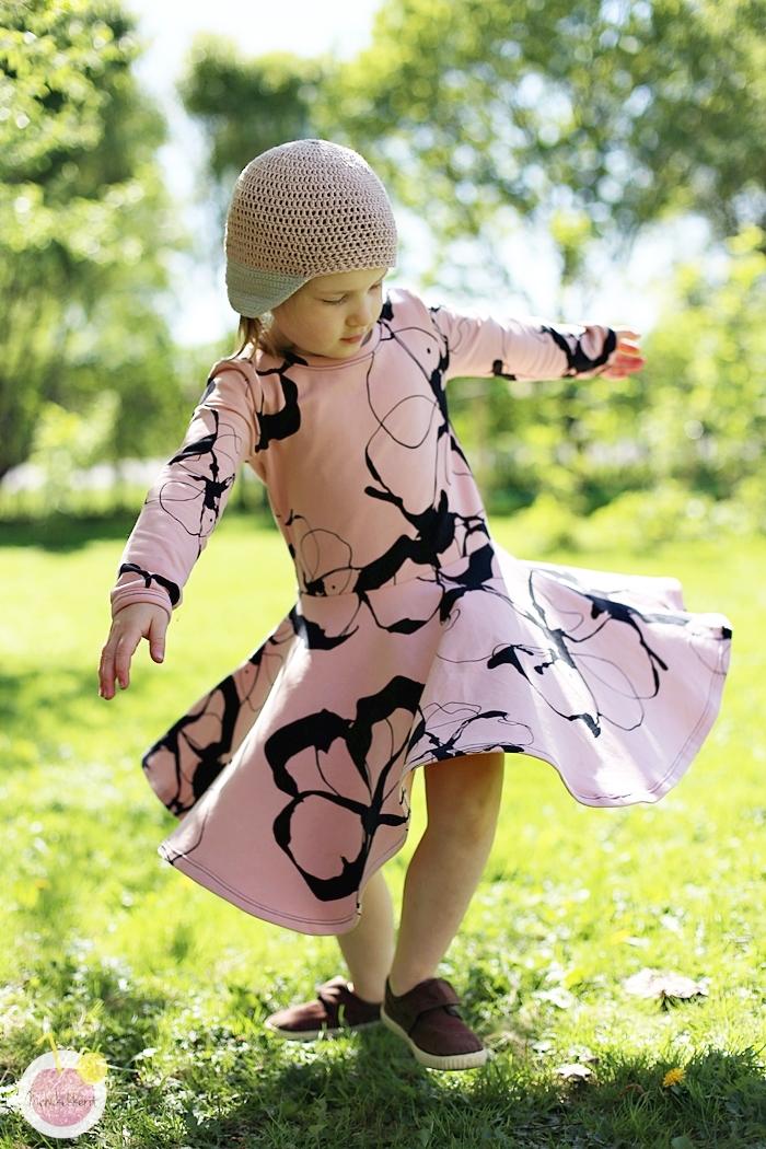 Ostin NOSHin uutta KUKINTO printtiä jo joku aika sitten. En ihan heti osannut päättää sopivaa väriä, joten ostin huomaamattani vähän valinnan varaa. Näköjään viisivuotias on tullut äitiinsä, sillä hänkään ei osannut päättää sopivaa mekkoväriä, vaan valitsi kaksi. Siispä pyynnöstä ompelin hänelle kaksi mekkoa, peruspaitakaavaa käyttäen.
