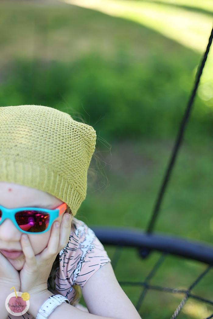 Toisin kuin tavallinen kolmiohuivi, pantahuivi pysyy päässä ilman solmuja. Lapsi saa puettua sen itse heti ja helposti, ja ohuesta puuvilla- tai pellavalangasta neulottuna tämä tuntuu päässä jopa mukavan viileältä. Ja mikä parasta, suojaa päätä silti auringolta. Meidän perheessä se on tarpeen, sillä lapset tuntuvat kärsivän päänsäryistä heti jos hattu tai aurinkolasit unohtuvat sisälle.