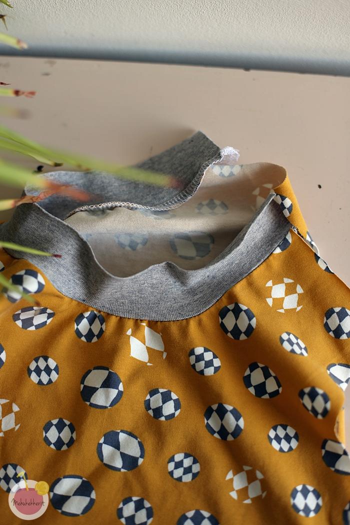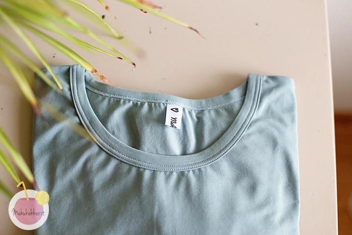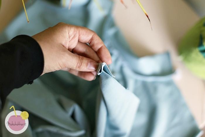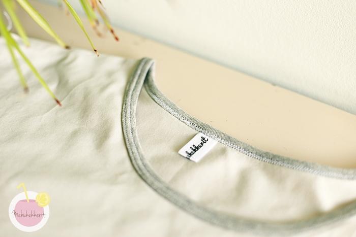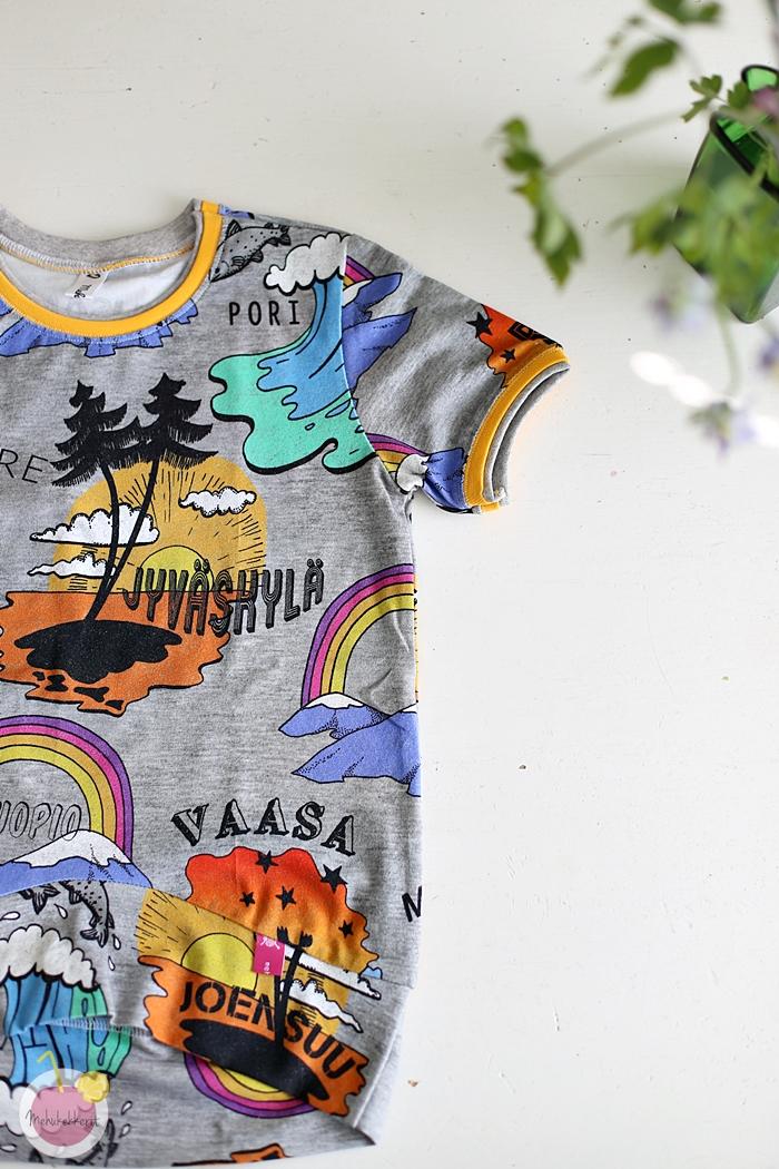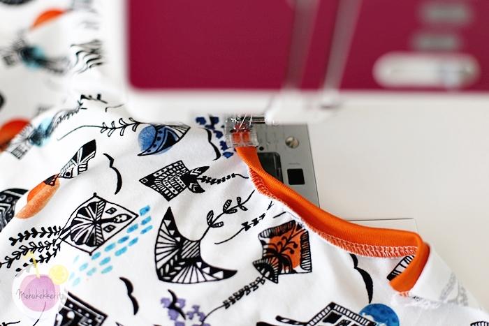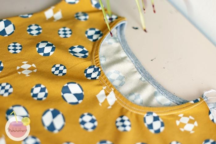6. Silitä kunnolla ja ompele muu paita tai mekko loppuun. Ompele siis seuraavaksi hihat (niiden huolittelu on hyvä tehdä samalla tapaa kuin pääntie), ja huolittelun jälkeen ompele ne kiinni miehustaan. Ompele sivusaumat ja huolittele helma kaksoisneulan tikillä.