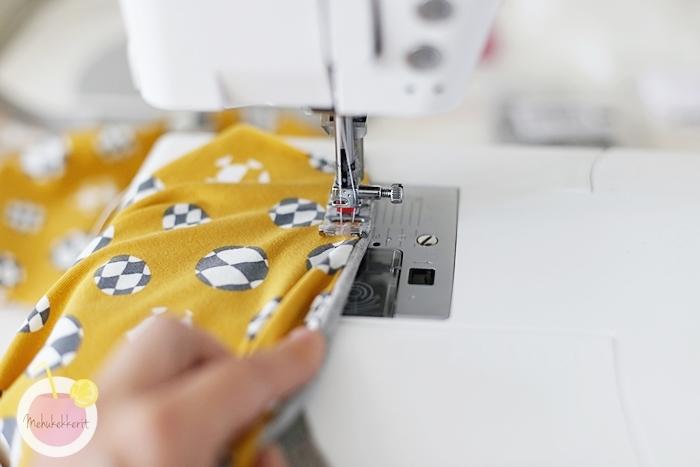 - Taita se puoliksi ja ompele taitetun resorin oikea puoli miehustan nurjaa puolta vasten.