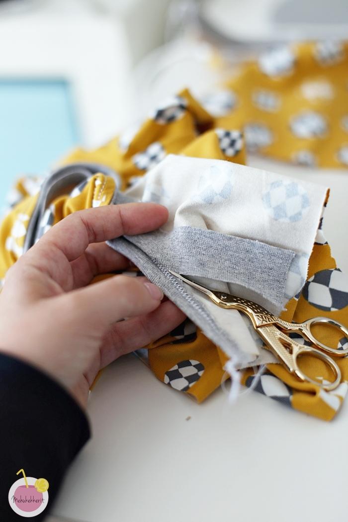 - Ompele kiinni saumurilla pääntielle, oikeat puolet vastakkain. Venytä molempia yhtä paljon samaan aikaan!