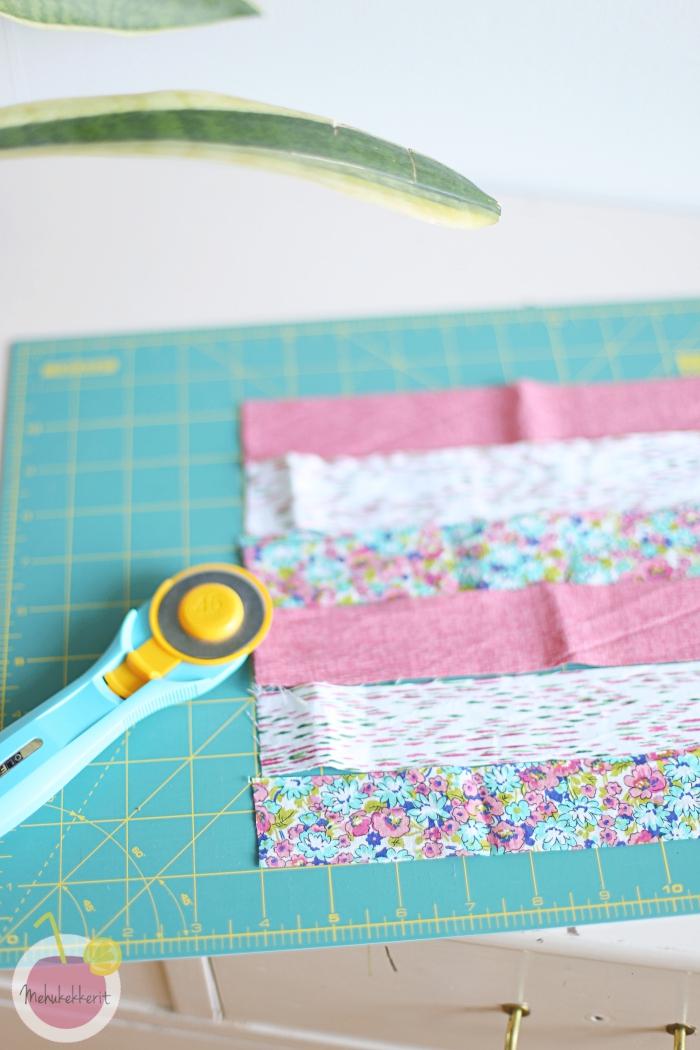 Tilkkutöissä tärkeintä on tarkat mitat. Huomasin heti, että leikkuri ja leikkuualusta ovat lähes välttämättömät, samoin kuin kärsivällisyys ja kunnon suunnittelu etukäteen. Tuon viimeisen nimittäin unohdin, ja se näkyy pussukan toisella puolella enemmän kuin hyvin.