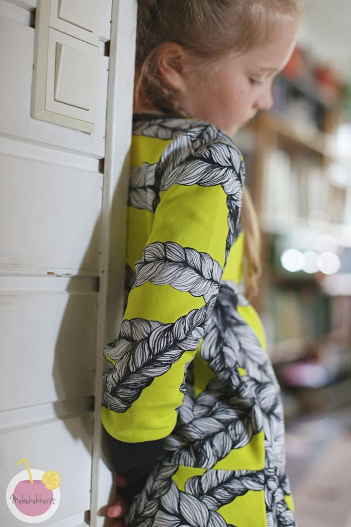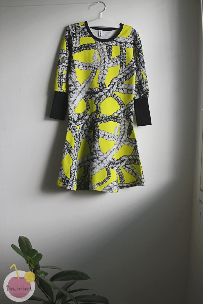 Ompelin paitakaavaan helmaan kiinni puolikellohameen, ja hihoihin pitkät resorit. Vielä pidemmätkin olisivat kelvanneet, joten tarvitsee ehkä vielä vaihtaa heti pidemmin kun rikkoontuvat, jotta käyttöikää voi pidentää mahdollisimman pitkäksi. Kuvittelin kukkamekon silti voittavan, mutta niin vain lapsi on tällä viikolla halunnut pukea tämän mekon päälle monta päivää peräkkäin. Taisin vihdoin onnistua siis tyylikkyydessä koululaisen silmissä!