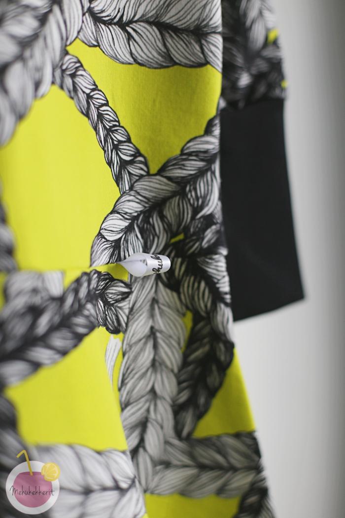 Mietin pitkään mikä voisi olla tarpeeksi tyylikästä mekkokankaaksi. Löysinkin yhden kukkakankaan tummalla pohjalla, mutta hieman syvemmälle kangaslaatikkoa kaivamalla löysin myös jo vuosi tai pari sitten ostetun Vimman lettikankaan. Tämä on ollut vähintään päheä, ajattelin jopa minä. Turhan kirkas huppariksi, eikä oikeaa kohdetta ole vielä ilmaantunut. No nyt se tuli, ekaluokkaisen mekkohan se siinä!