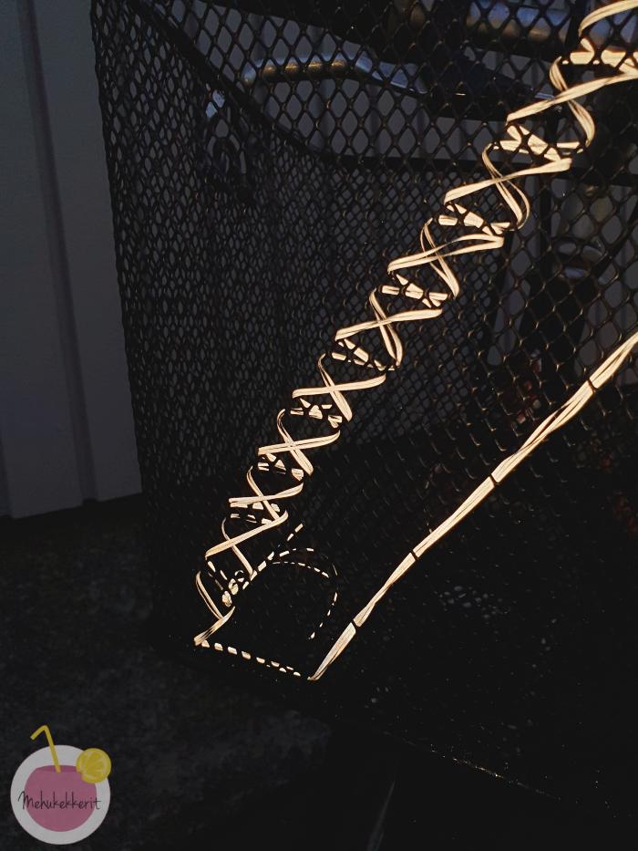 Niinpä otin heijastinlankaa, ja leikkasin siitä 3 kpl noin 150 cm pitkiä nauhoja. Pujottelin ne kaikki kolme yhtä aikaa ison tylpän neulan avulla pyörän koriin. Tällä kertaa hain hieman ristipistomaista tunnelmaa. Saa nähdä olenko tähän käytössä kuinka tyytyväinen, vai tulenko korjaamaan myös tätä.