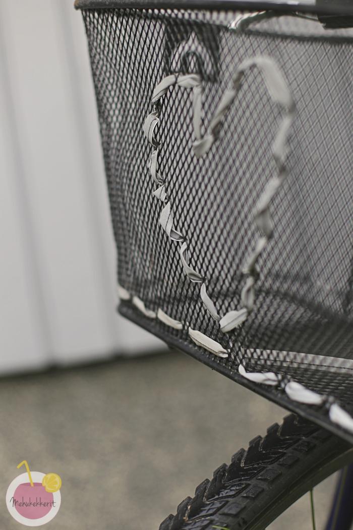 Pyörän koristelu heijastimilla onnistuu parhaiten juuri oman maun mukaan. Itse ompelin ensin 2 cm leveää heijastinnauhaa puoliksi ja pujottelin sitä pyörän koriin kuvioksi. Nauha oli korin väleihin hitusen liian leveää, ja seuraavana päivänä kuviokaan ei oikein sopinut pyörän muuhun ilmeeseen.