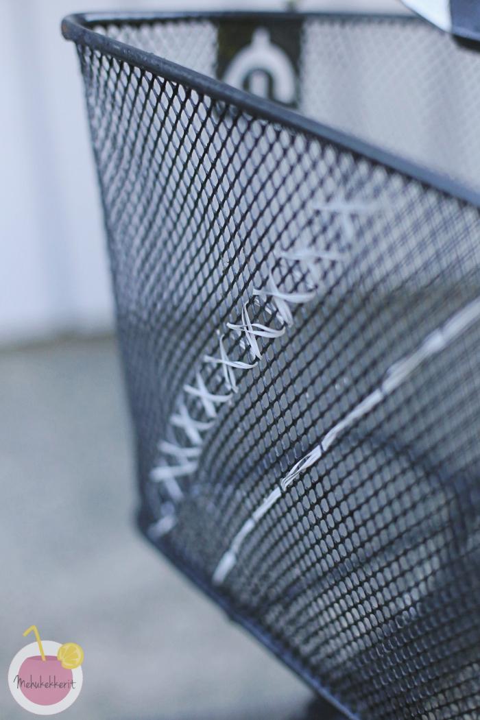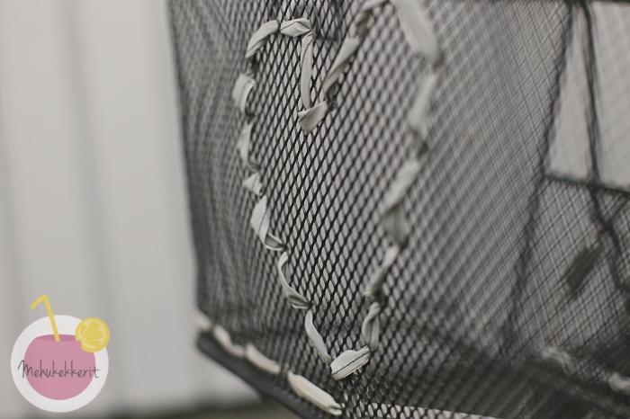 Niinpä otin heijastinlankaa, ja leikkasin siitä 3 kpl noin 150 cm pitkiä nauhoja. Pujottelin ne kaikki kolme yhtä aikaa ison tylpän neulan avulla pyörän koriin. Tällä kertaa hain hieman ristipistomaista tunnelmaa. Saa nähdä olenko tähän käytössä kuinka tyytyväinen, vai tulenko korjaamaan myös tätä.