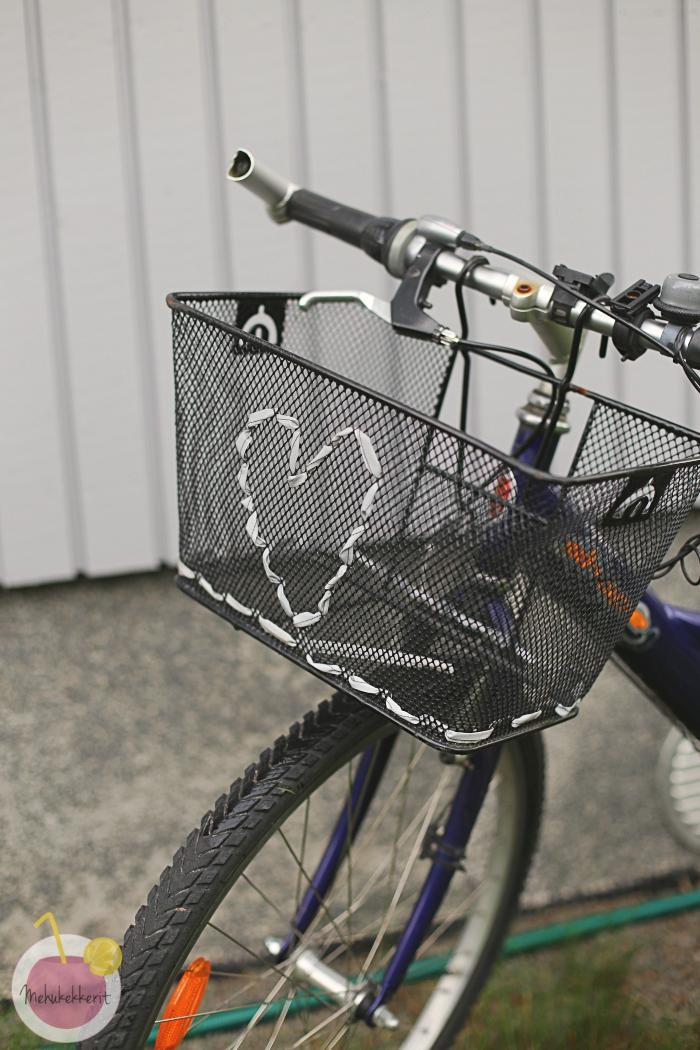 Pyörän koristelu heijastimilla onnistuu parhaiten juuri oman maun mukaan. Itse ompelin ensin 2 cm leveää heijastinnauhaa puoliksi ja pujottelin sitä pyörän koriin kuvioksi. Nauha oli korin väleihin hitusen liian leveää, ja seuraavana päivänä kuviokaan ei oikein sopinut pyörän muuhun ilmeeseen.