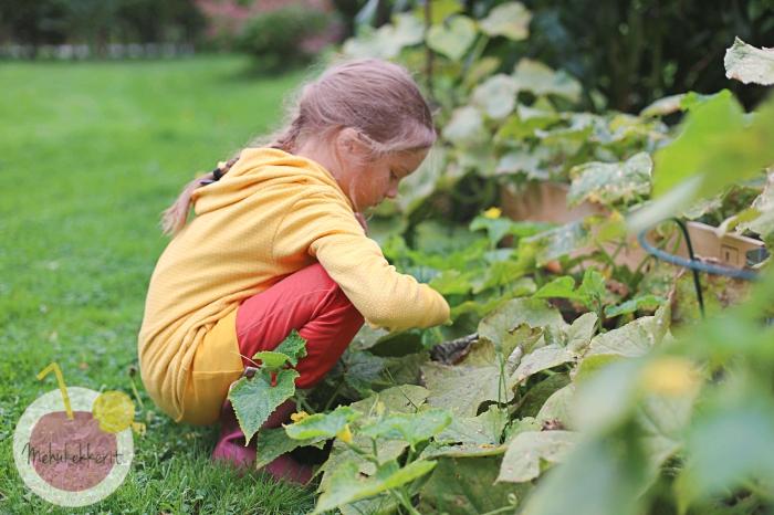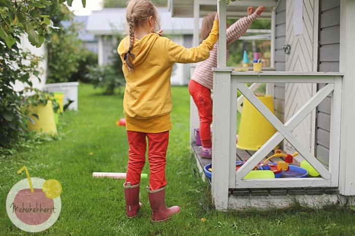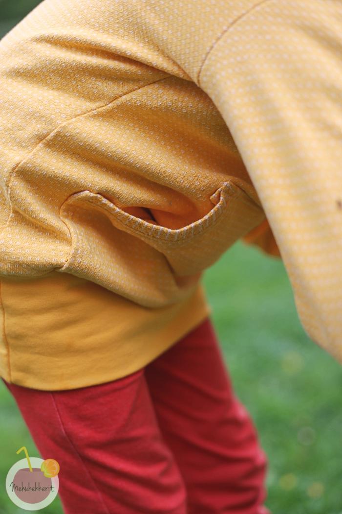 Alunperin lapsi toivoi minulta samanlaista jakkua, jollaisia käytän paljon itsekin. Ehkä sellainen on luvassa sitten seuraavaksi, mutta nyt ainakin näin alkuun halusin kuitenkin ommella hänelle uuden hupparin Silmu-kankaasta. Tästä tulikin lapsen mielestä todella hyvä, ja se on ollut nyt yksi viikon käytetyimmistä vaatteista. Kaava on Mekkotehtaan koululaisten kirjasta, kahden paita koossa 128 cm. Tein siitä siis hupullisen version ja lisäsin helmaan vielä kätevän anorakkitaskun, tutun omasta lapsuudestani.