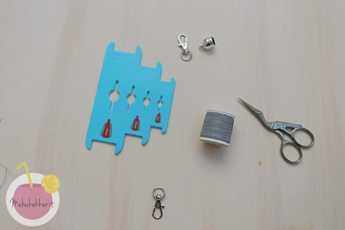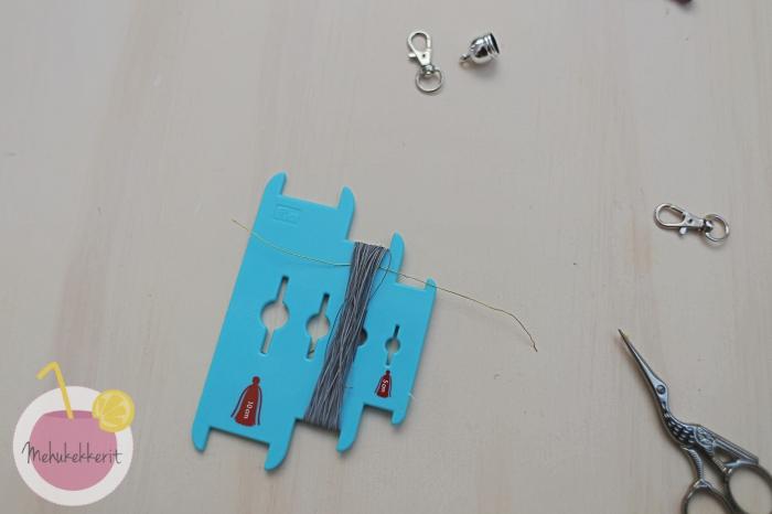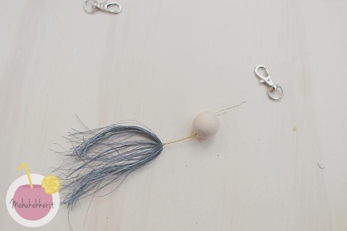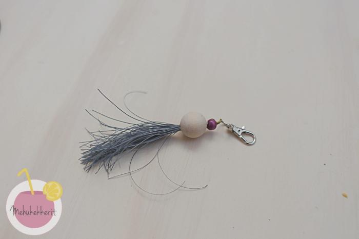 Heijastava tasseli on helppo tehdä itse, joko kaukosäätimen tai esim. puuhaarukan ympärille. Minä käytin Prymin tasseliin tarkoitettua apuvälinettä, jolla tämä syntyi käden käänteessä. Tasseleihin voi lisätä ns. tasselihattuja tai koristella niitä muuten oman maun mukaan. Minä pujotin hatuksi isohkon puuhelmen, joka pitää tasselia myös paikoillaan.