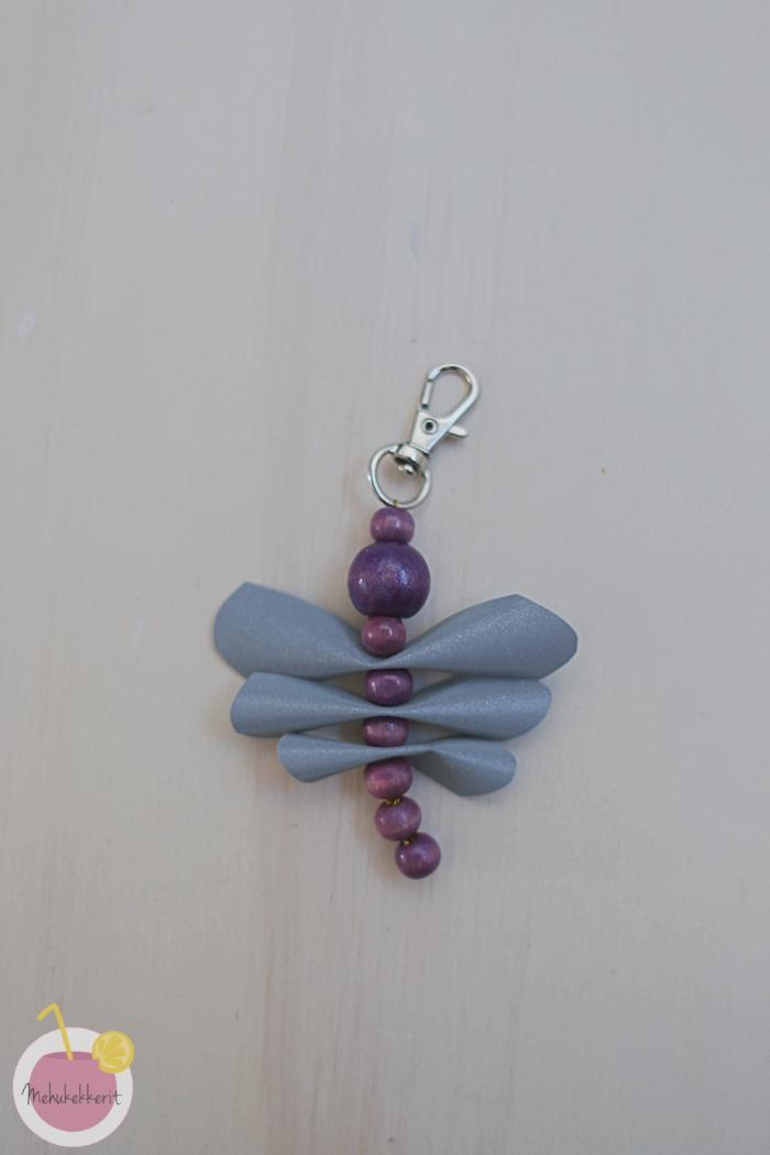 Korentoihin on monta ohjetta, ja yksi löytyy esim. Sinooperista tai Ruususuu ja huvikumpu-blogista. Minä yhdistelin vähän molempia, ja tein noin 2cm levestä heijastavasta nauhasta kolme eri mittaista pätkää, joiden läpi pujottelin rautalankaa ja yhdet helmet. Pari helmeä vielä lisää, ja rautalangan kiepsuttelua niiden ympäri.