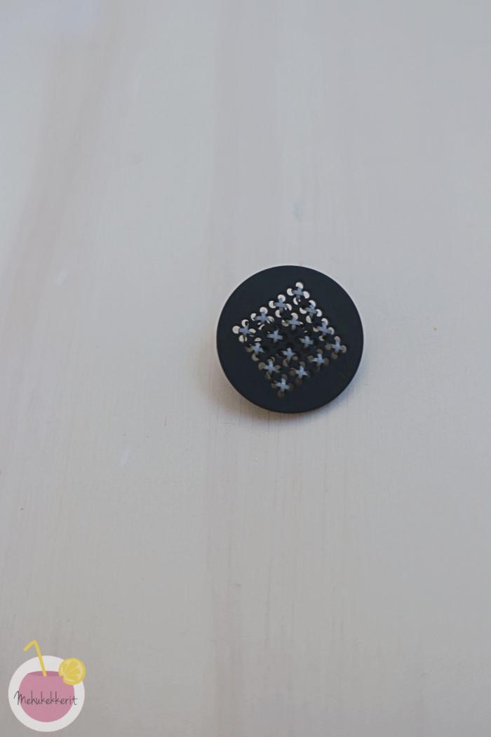 Sain Prymiltä testiin nappeja, joihin “kirjoin” heijastinlankaa. Tämä ei ole kovin kauas näkyvä heijastin, mutta on ainakin ainutlaatuinen. Taakse kiinnitin kuumaliimalla rintaneulan.