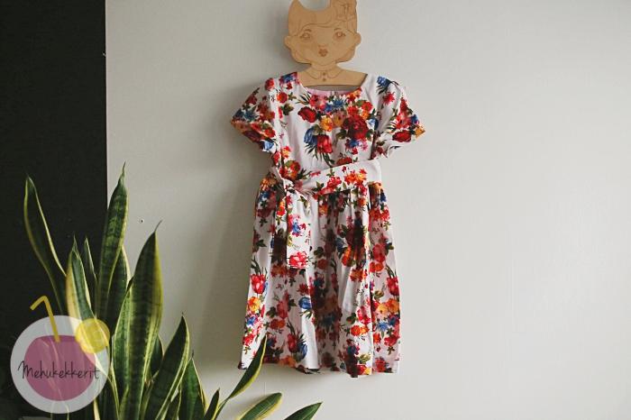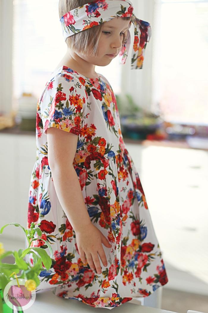 Tälläkin kertaa tajusin sen vähän viiveellä. Lapsen kaverisynttäreiden aamuna tajusin, ettei synttärisankarilla ole mekkoa. Olin kyllä kesällä leikannut hänelle juhlamekon, mutta siinä ompelupöydällä ne kankaan palaset odottivat yhä. Ihana kukkakangas on samaa kuin omassa mekossani, ja se on ostettu Hollolassa sijaitsevasta Zalekua Outletista.