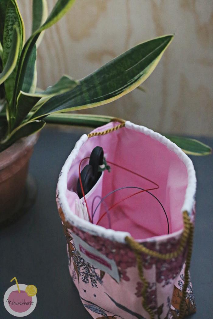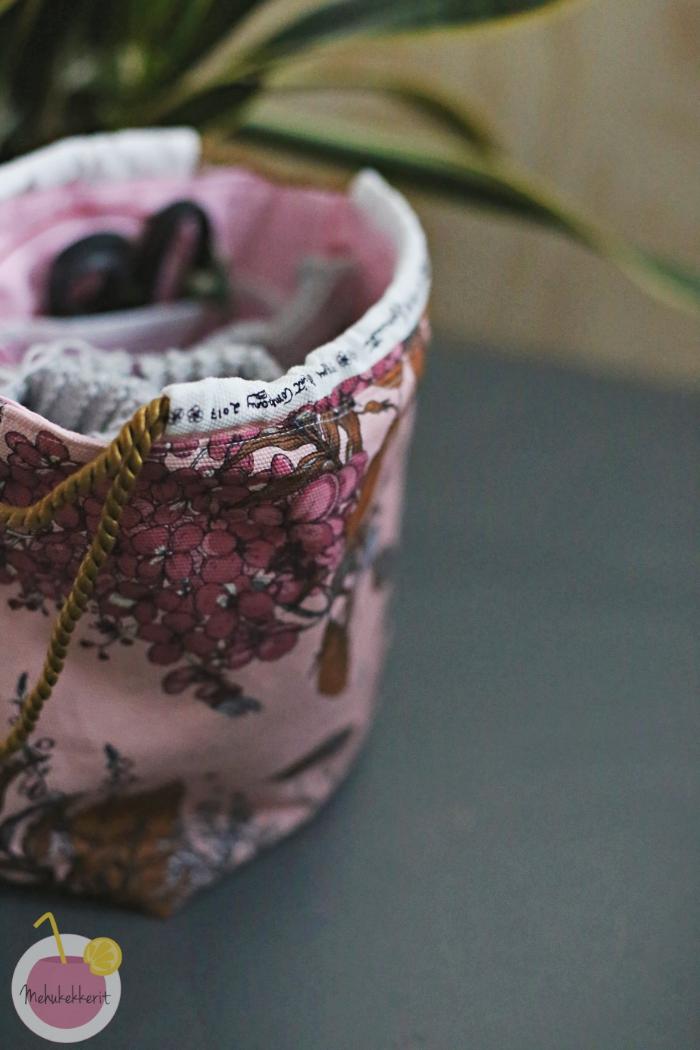 Projektipussukkaan hain inspiraatiota Nova Melinan kauniista pussukoista. Tein aluksi hieman liian suuren, joten kavensin ja lyhensin mittoja hieman lisää. Kankaan kauniit hulpiot käytin teksteineen pussukan kiristyskujina, ja naruksi löysin vanhan verhojen vyön.  Sisustan vuori on napakkaa puuvillaa, ja sieltä löytyy tosiaan eri kokoisia taskuja niin puikoille kuin saksillekin.