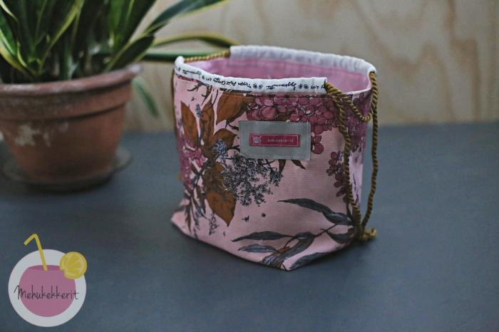 Projektipussukkaan hain inspiraatiota Nova Melinan kauniista pussukoista. Tein aluksi hieman liian suuren, joten kavensin ja lyhensin mittoja hieman lisää. Kankaan kauniit hulpiot käytin teksteineen pussukan kiristyskujina, ja naruksi löysin vanhan verhojen vyön.  Sisustan vuori on napakkaa puuvillaa, ja sieltä löytyy tosiaan eri kokoisia taskuja niin puikoille kuin saksillekin.