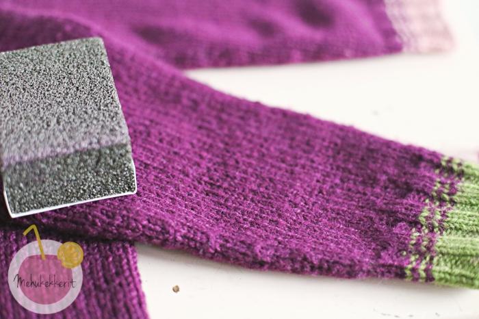 Minä testasin nyt vain näitä kahta nypynpoistajaa. Enemmän testausta elektronisten nypynpoistajien eroista kannattaa tarkastalle vielä Kuningaskuluttajan testistä, ja yksi hyvä kikka löytyi myös Oh, wie Nordisch-blogista. Minun testaamaani Sweates Stonea myy esim. Titityy. Ja kuten kuvista näkyy, tuloksissa on eroja. Alla näkyvälle 100% villalle voisin vielä hyväksyä myös Sweater Stonen, mutta käytössä kunnolla kuluneisiin tumppuihin laatustantardini läpäisi vain elektroninen vaihtoehto.