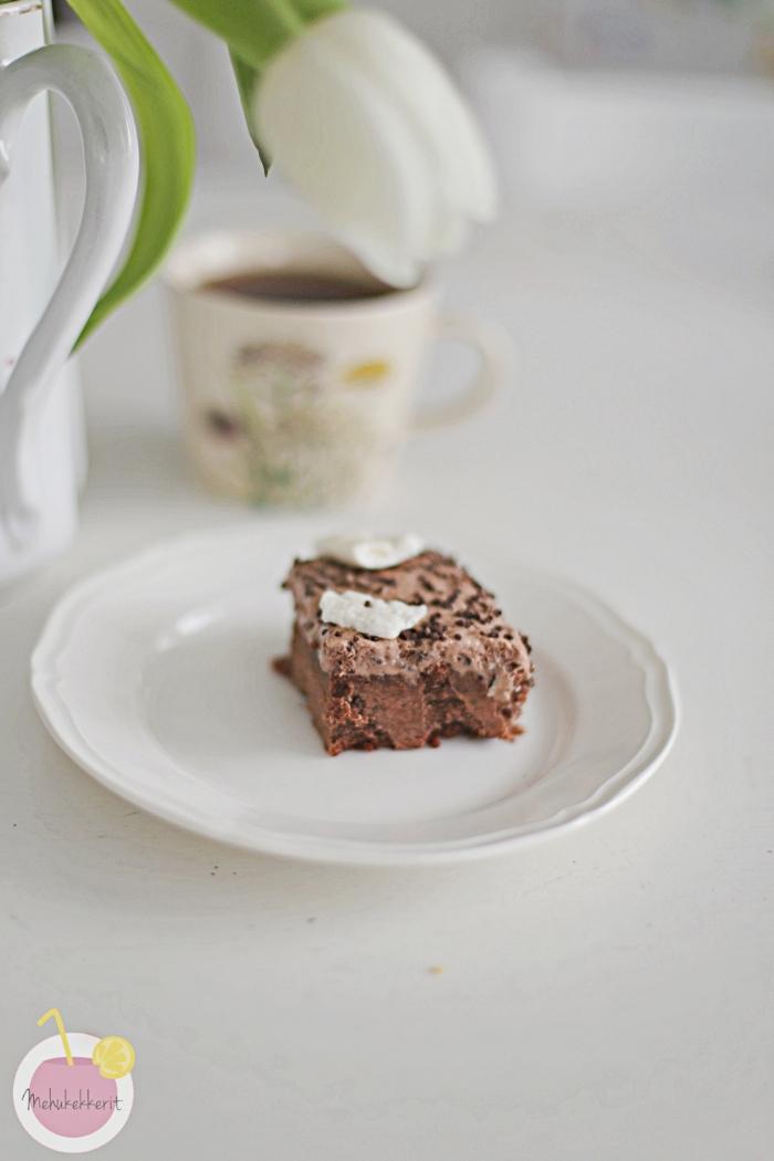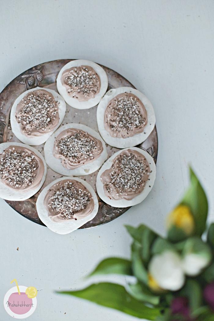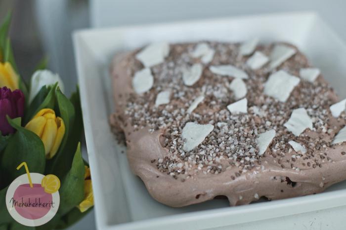 Suklaakakun lisäksi leivoin vielä vegaaniset marengit, joiden päälle pursotin yli jäänyttä kuorrutetta. Erehdyin tekemään tämän hitusen liian aikaisin ennen juhlia, ja vielä toisena erehdyksenä säilytin niitä jääkaapissa pari tuntia. En suosittele, jos ei halua sitkeitä ja lötköjä marenkeja. Vegaanisten marenkien ohje löytyy esim Chocochilin blogista. Mutta suklaakakku sen kuin paranee jääkaapissa seuraavana päivänä, joten se maistuu mainiosti myös rääppiäisissäkin.