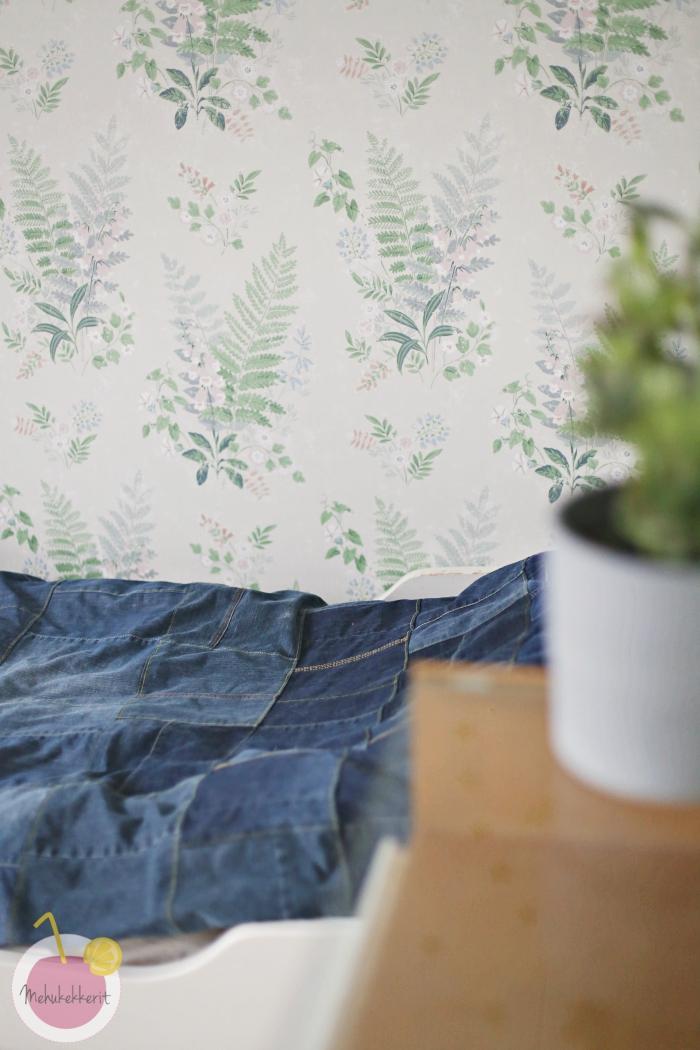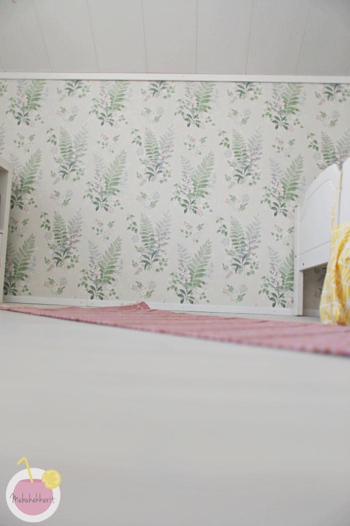 Koululaisen huone rakennettiin pääosin vanhoja tavaroita hyödyntäen. Hän sai itse valita tapetin, ja päätyi Borås Tapeterin herkkään saniaistapettiin. Tapetti on mallistosta In Bloom ja sen nimi on Foxglove 7222. Aika ihana minunkin mielestäni!
