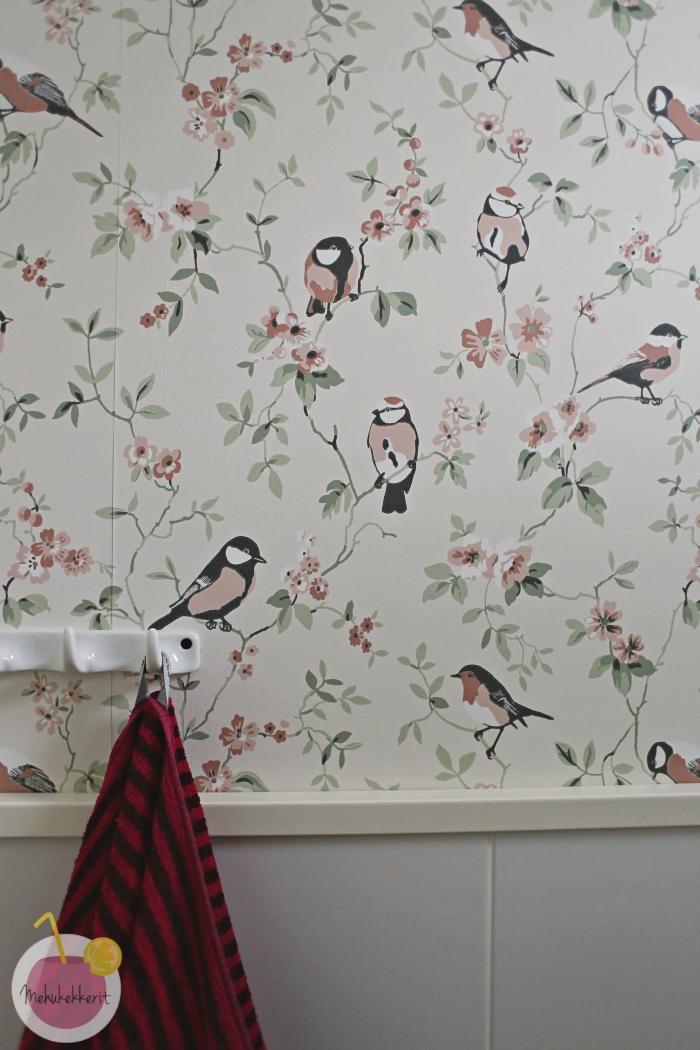 Alunperin koululainen olisi halunnut tämän tapetin huoneeseensa. Pohdimme kuinka pitkään hän mahtaa tykätä linnuista, vai olisiko nyt valittu kukkatapetti kuitenkin parempi. Lopulta päädyimme ottamaan molemmat, ja linnut sovittiin piristämään vessaa.