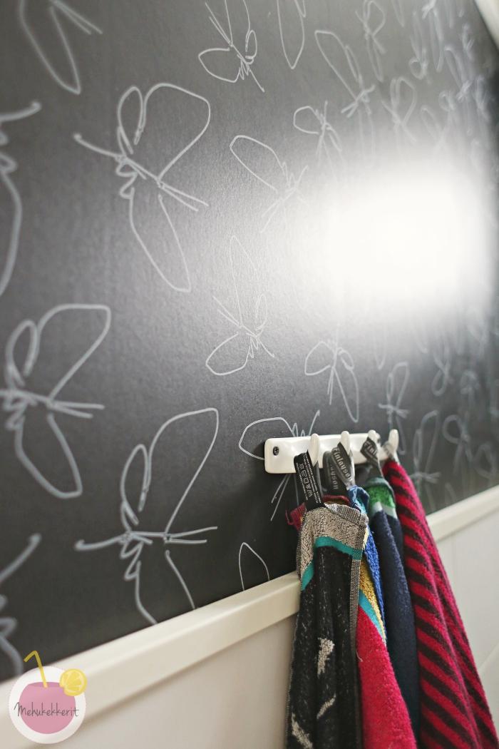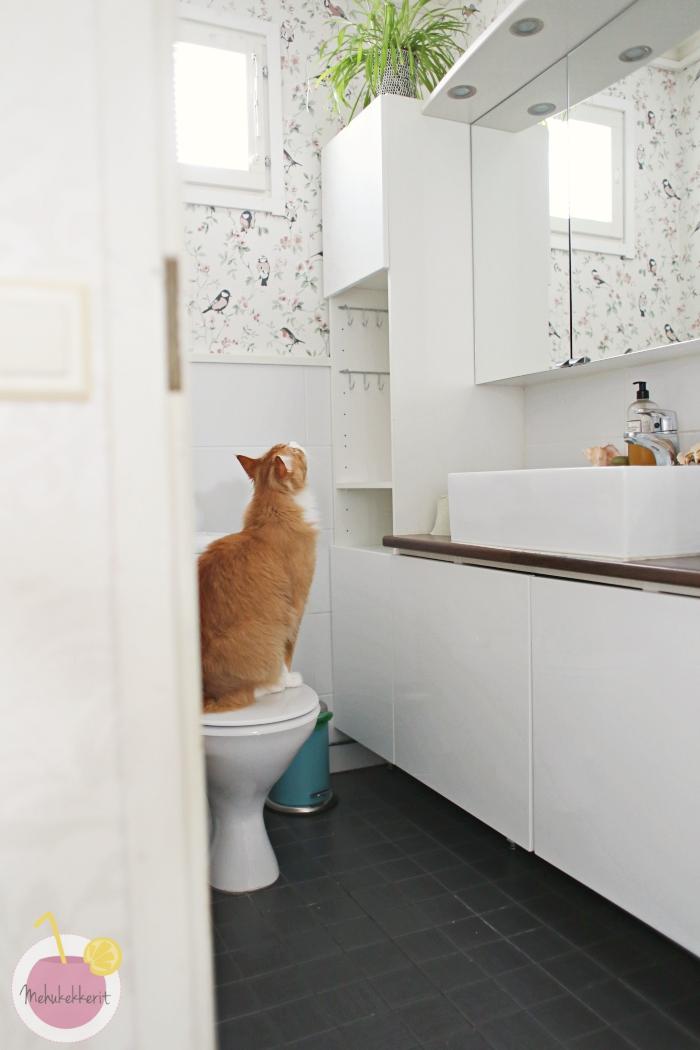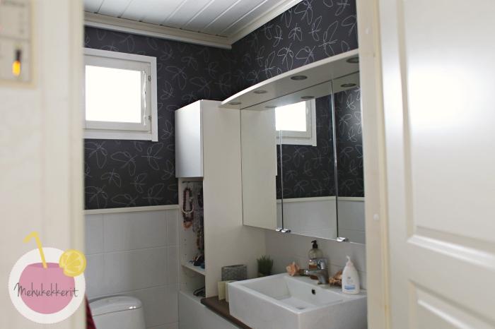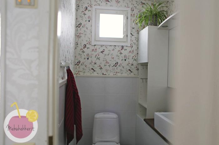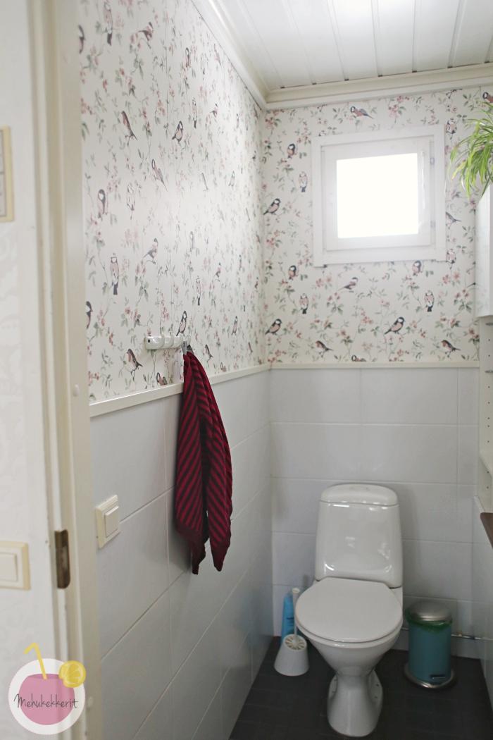 Mitään muuta remonttia vessaan ei tällä kertaa tehty. On kuitenkin jännittävää, miten paljon yksi tapetti kuitenkin muuttaa tilaa. Nyt aiemmin Metsänkylän Navetalta ostamani naulakko istuu siihen paremmin, ja pienestäkin tilasta tuli paljon avarampi. Ehkä jopa vähän liian romanttinenkin?