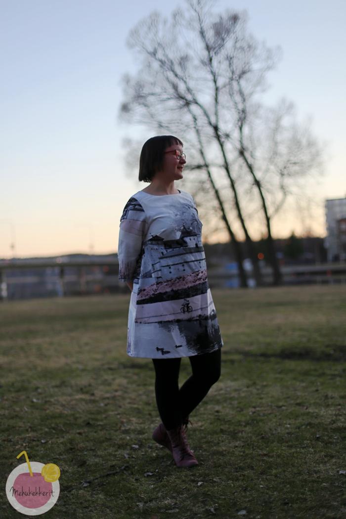 Ostin kankaan vähän kuin hametta varten. Lopulta ompelin siitä mekon, ihan perusmekon. Otin kaavaan pohjaa Mekkotehtaan kirjasta, mutta muokkasin kaavaa jonkin verran. Madalsin esimerkiksi pääntietä, pidensin olkasaumoja ja syvensin rintamuotolaskoksia. Aiemmin tein jo samalla kaavalla kukkamekon, joten tiesin miten lähden muuttamaan kaavaa.