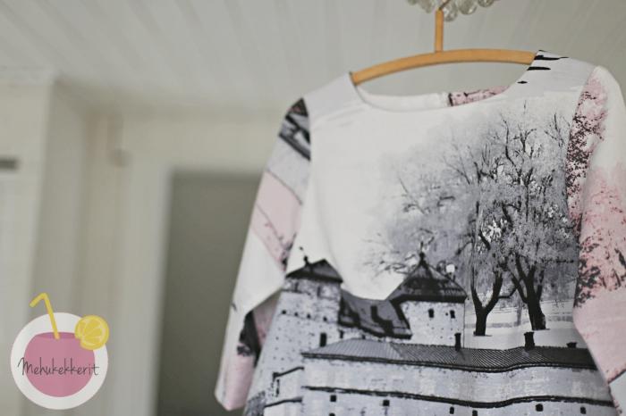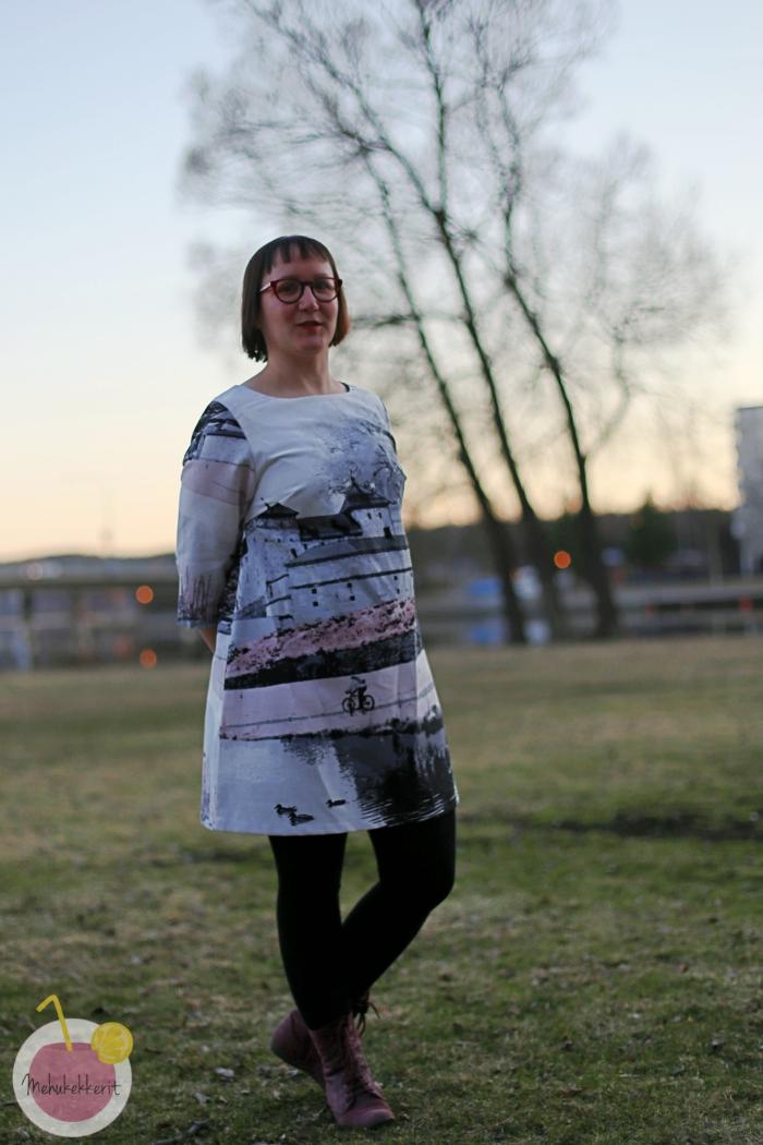 Olen totuttautunut pitämään mekkoja vyön kanssa. Nyt tähänkin sitä yritin, mutta toisaalta halusin tuoda nimenomaan linnan esiin. Ja siinä se on, Hämeen linna. Ylväänä ja tukevana.