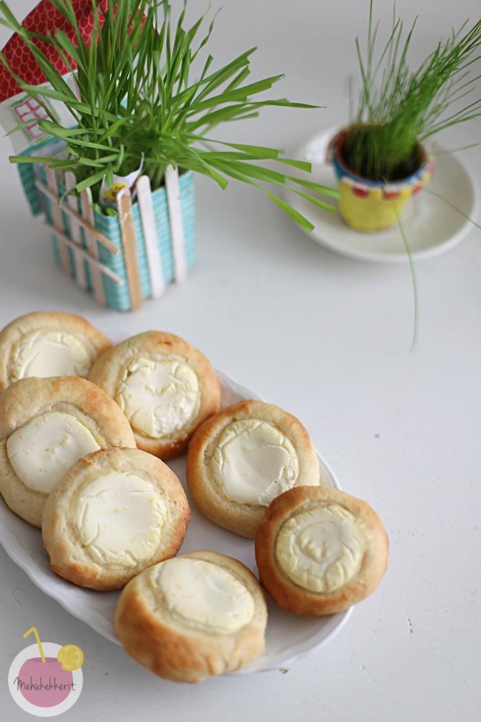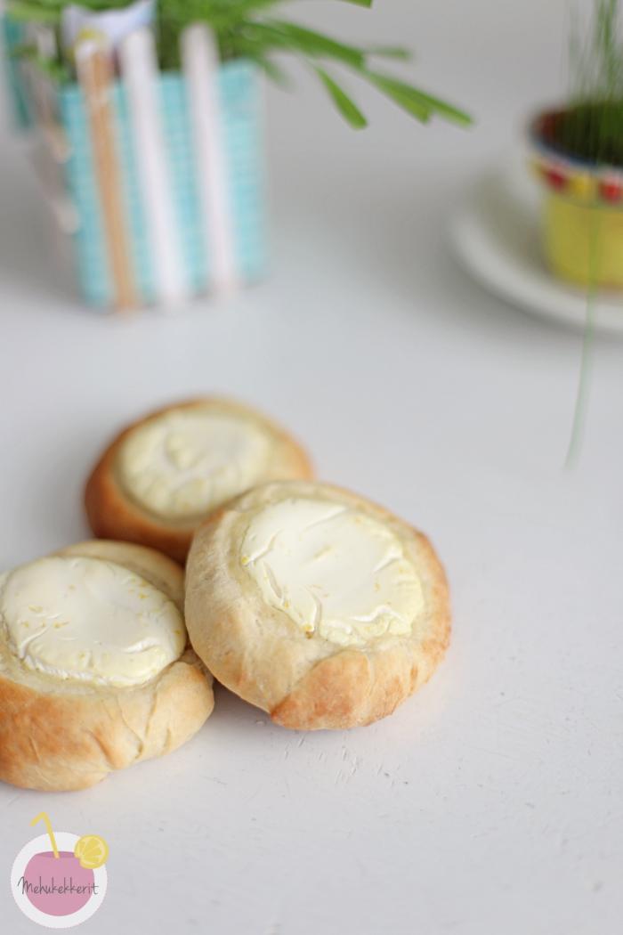 Aiemmin jo talvella totesimme pullien onnistuvan hyvin myös ilman maitoa ja kananmunaa. Haasteeksi muodostui siis se rahkatäyte, jonka korvasimme soija”rahkalla”. Siihen vielä puolikkaan sitruunan kuori ja mehu, ja täytteestä tuli yllättävän raikas ja toimiva.