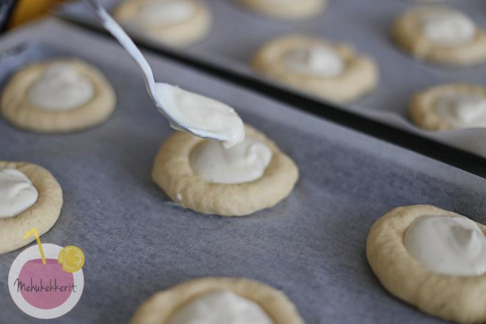 Paina lasin pohjalla pullien keskelle kolo täytettä varten. Levitä täyte pullien päälle.