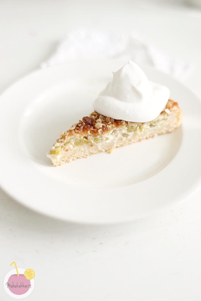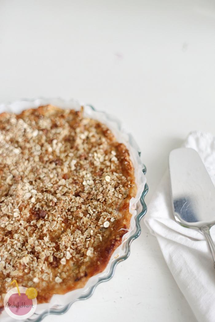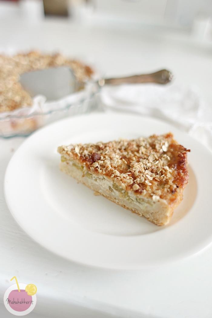Tämä raparperipiirakka on siis maidoton ja munaton, eli vegaaninen. Täyte syntyy soijajugurtin ja raparperin yhdistelmästä, jonka kruunaa päälle ripoteltava kauraseos. Piirakan voi nauttia sellaisenaan, tai vegaanisen kaura- tai soijakerman kera.
