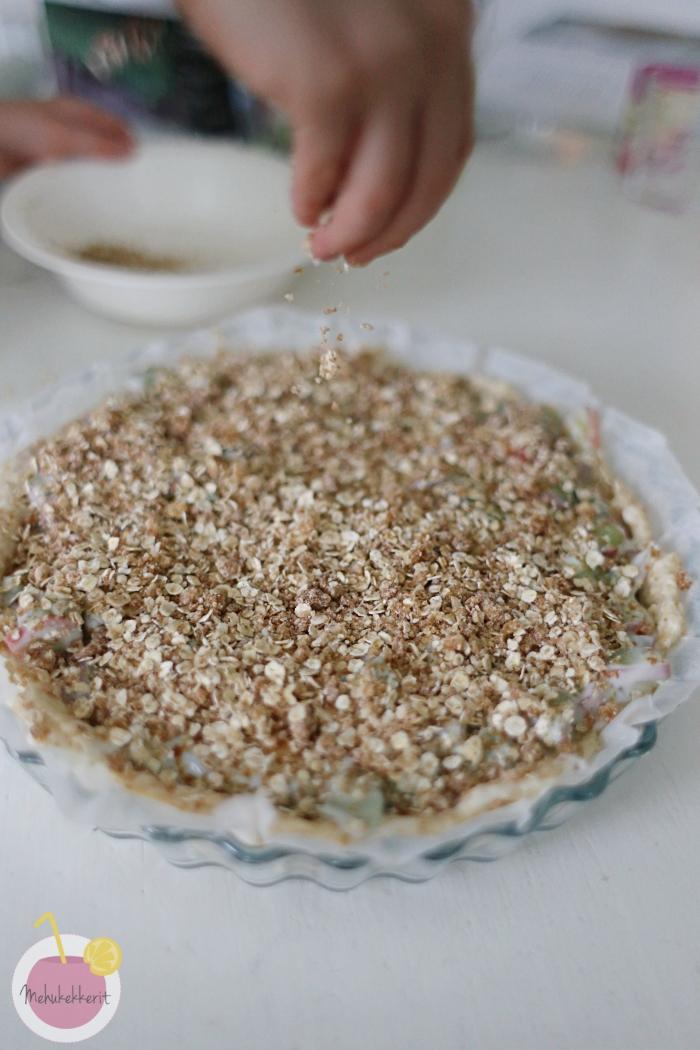 Yhdistä murupäällisen aineet keskenään ja sekoita murumaiseksi seokseksi. Ripottele seos tasaisesti raparperitäytteen päälle.